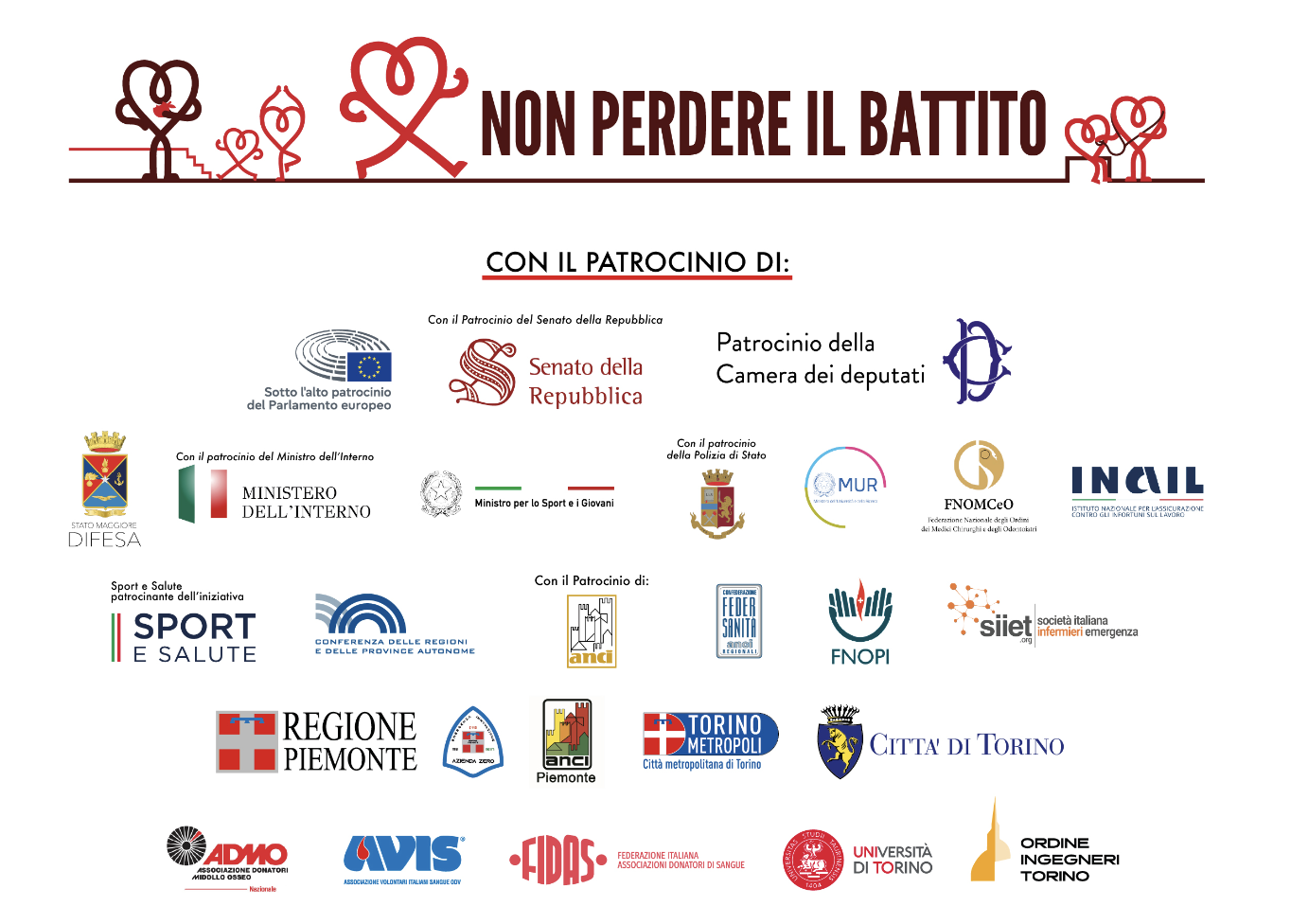La Giornata Mondiale per il Cuore nel 2023, organizzata in Italia dall’Associazione Italiana Cuore e Rianiamazione Onlus, ha ricevuto il Patrocinio di diversi enti: Camera dei Deputati, Senato della Repubblica, Presidenza Consiglio dei Ministri, Ministero della Salute, Ministero dell’Istruzione, Ministero dell’Interno Dipartimento Vigili del Fuoco, Regione Lazio, Regione Piemonte, Consiglio Regionale del Piemonte, Provincia di Piacenza, Città di Torino, Comune di Piacenza, Comune di Catania, ASL Città di Torino, AO Ordine Mauriziano Torino, ASL RM1 ASLRM2-Presidio Pertini, Centro Regionale Sangue Lazio, Ausl di Piacenza, OMCEO Torino, FNOPI Roma, OPI Torino, OPI Catania, Anpas, Ircom, Dan Divers Alert Network Europe