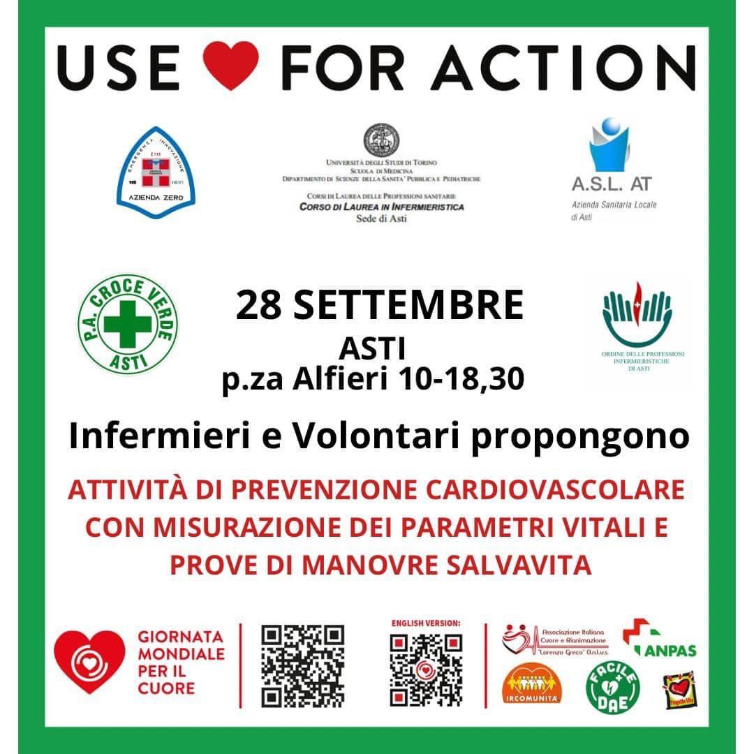 in occasione della Giornata Mondiale per il Cuore, si svolgerà ad Asti un’importante giornata dedicata alla prevenzione cardiovascolare. L’Ordine delle Professioni Infermieristiche di Asti e la Croce Verde di Asti, in collaborazione con ASL AT, Azienda Zero e corso di Laurea in Infermieristica dell’Università degli Studi di Torino – Sede di Asti, hanno organizzato un evento in cui saranno svolte attività di prevenzione, con misurazione dei parametri vitali e prove di manovre salvavita.